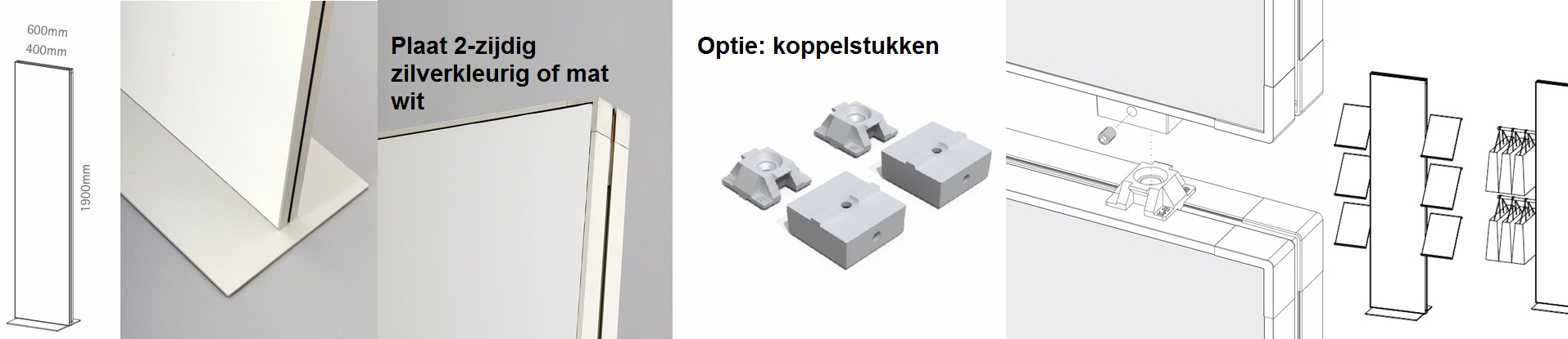 Strakke platte dibond zuil met geanodiseerde aluminium randprofiel. Zuil heeft een zilverkleurige voet en is voorzien van 2 dibond platen met een zilverkleurige en een mat witte kant waardoor men ter plekke de gewenste kleur kan kiezen. Zuil kan voorzien worden van meerdere opties, zoals folderhouders en tashouders en is tevens koppelbaar met andere zuilen en presentatiesystemen. Exclusief belettering. Belettering en opmaak belettering tegen meerprijs.Wilt u een prijs aanvragen?